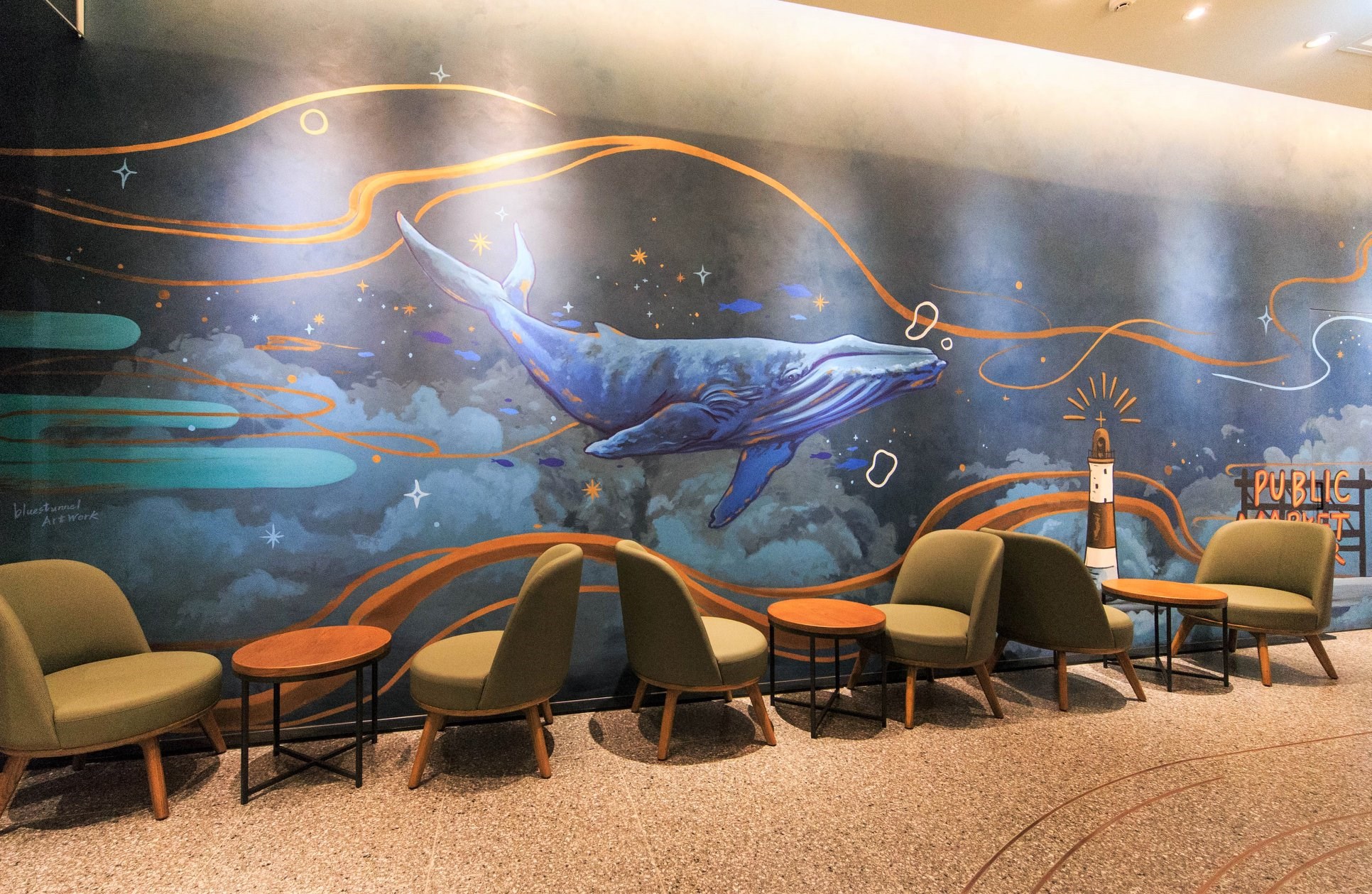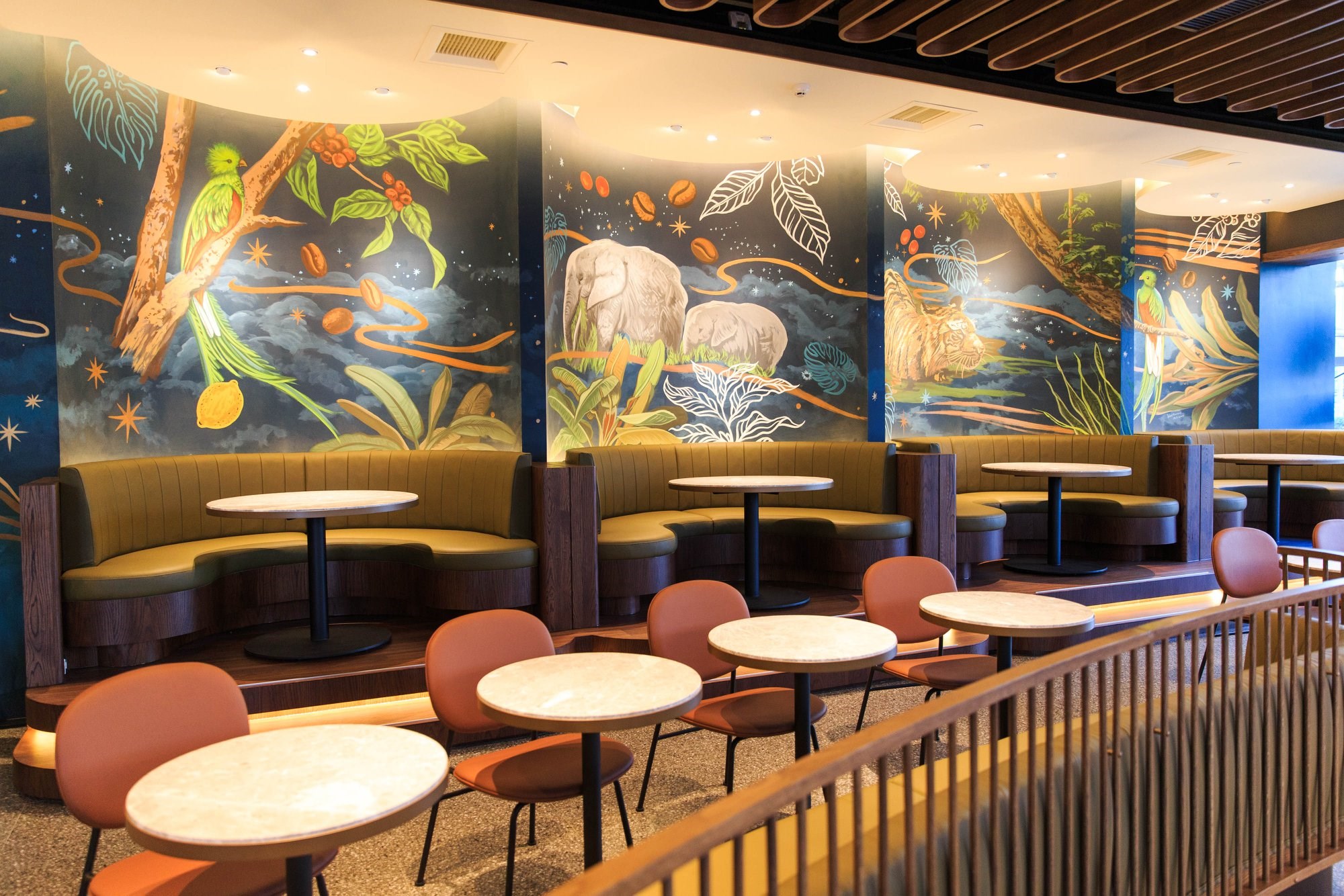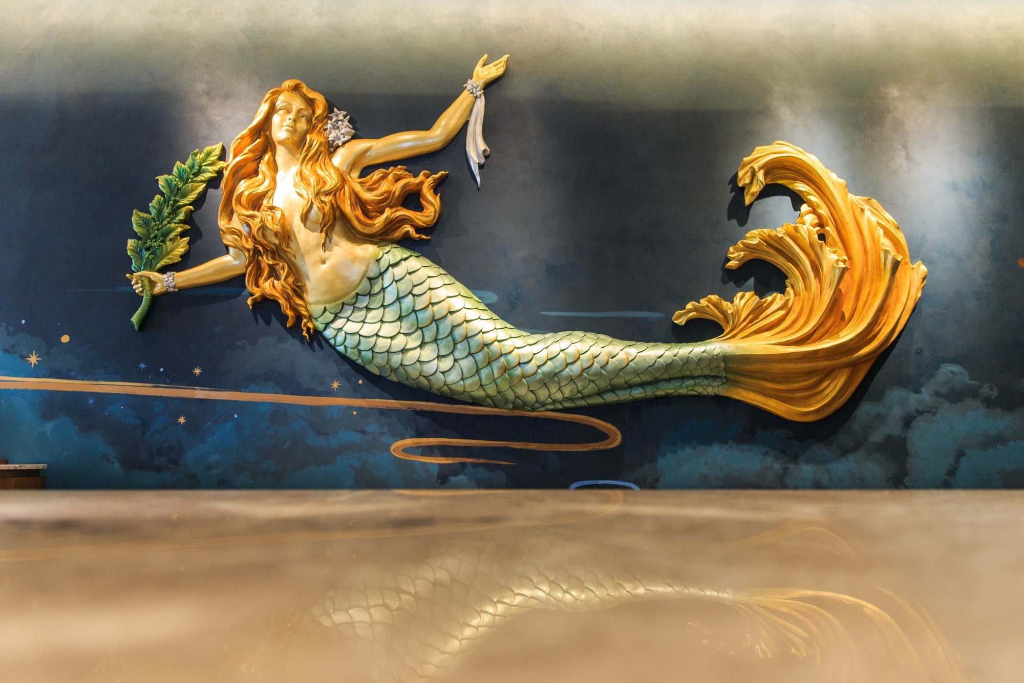 玻璃外觀裡面美到不行,遠遠就吸引不少過路人的目光,半圓形拱狀的門口家加上木質調的溫暖設計,咖啡香中又帶有浪漫餐酒館的迷人氣息,繽紛的彩繪藝術牆彷彿訴說著海洋與星巴克間的咖啡傳說,其中最受矚目的就是有一座以玻璃纖維製成的優游女神,優雅的氣質中還握著咖啡樹枝,一杯杯咖啡溫暖著旅人疲憊的身心靈,為他們打氣充電著,在夢幻的空間中與女神來場愜意的下午茶時光,真是令人相當放鬆。