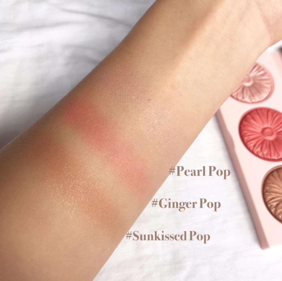 Ginger Pop 是一個有點珊瑚紅的顏色 很有活力又可愛的感覺,Sun kissed Pop就是一個土咖色 用來當修容也可以當腮紅但有珠光,最後是Pearl Pop色澤特變亮 用來上在鼻頭顴骨都很適合 有淡淡的粉嫩光澤