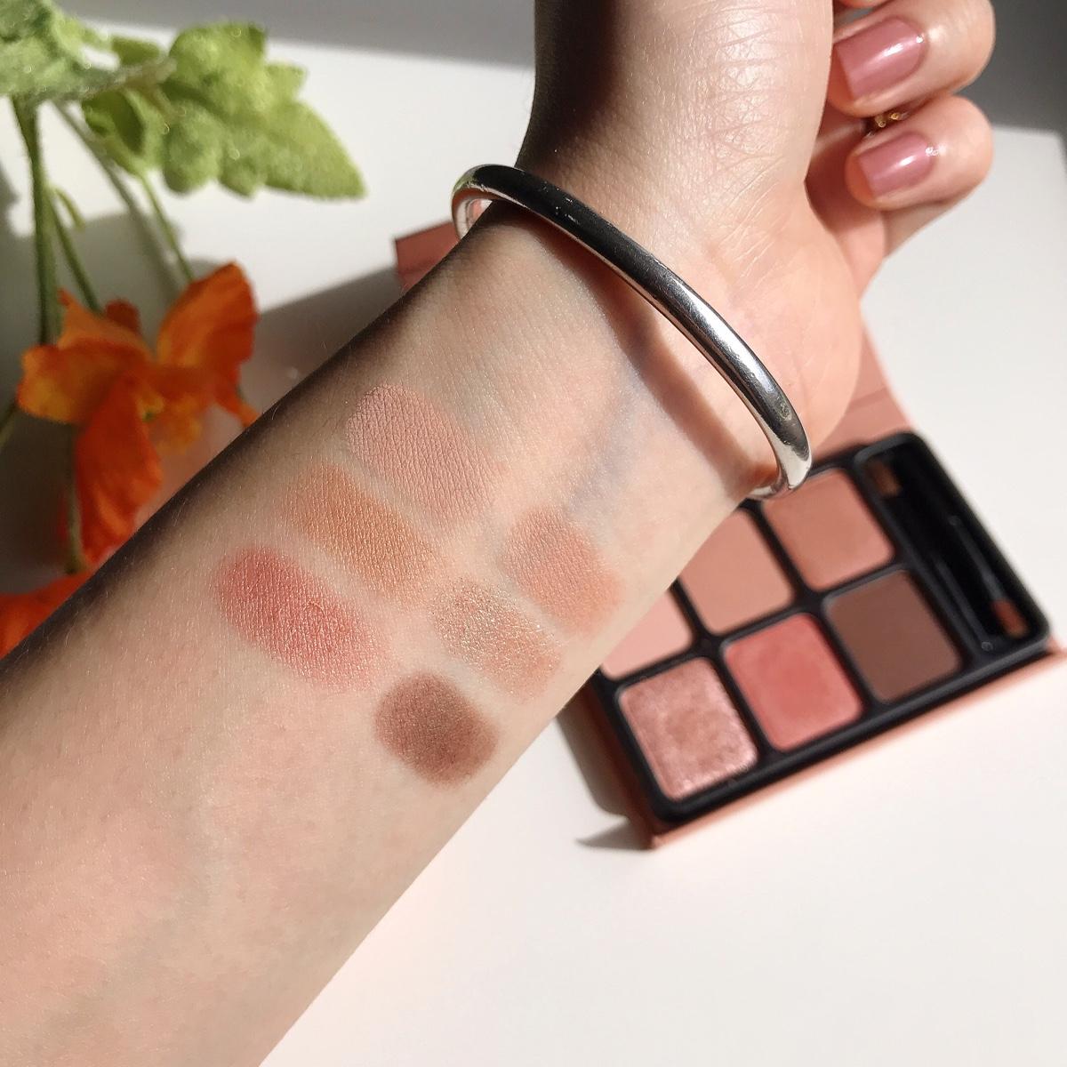 暖粉色,配上一點橘和咖啡色,企圖非常明顯,就是要讓使用這盤眼影的小姊姊們都變成柔柔粉粉卻有深邃眼神的小仙女🧚♀️啊,因為這盤的粉不是冷調,所以不會讓眼睛泡泡的,