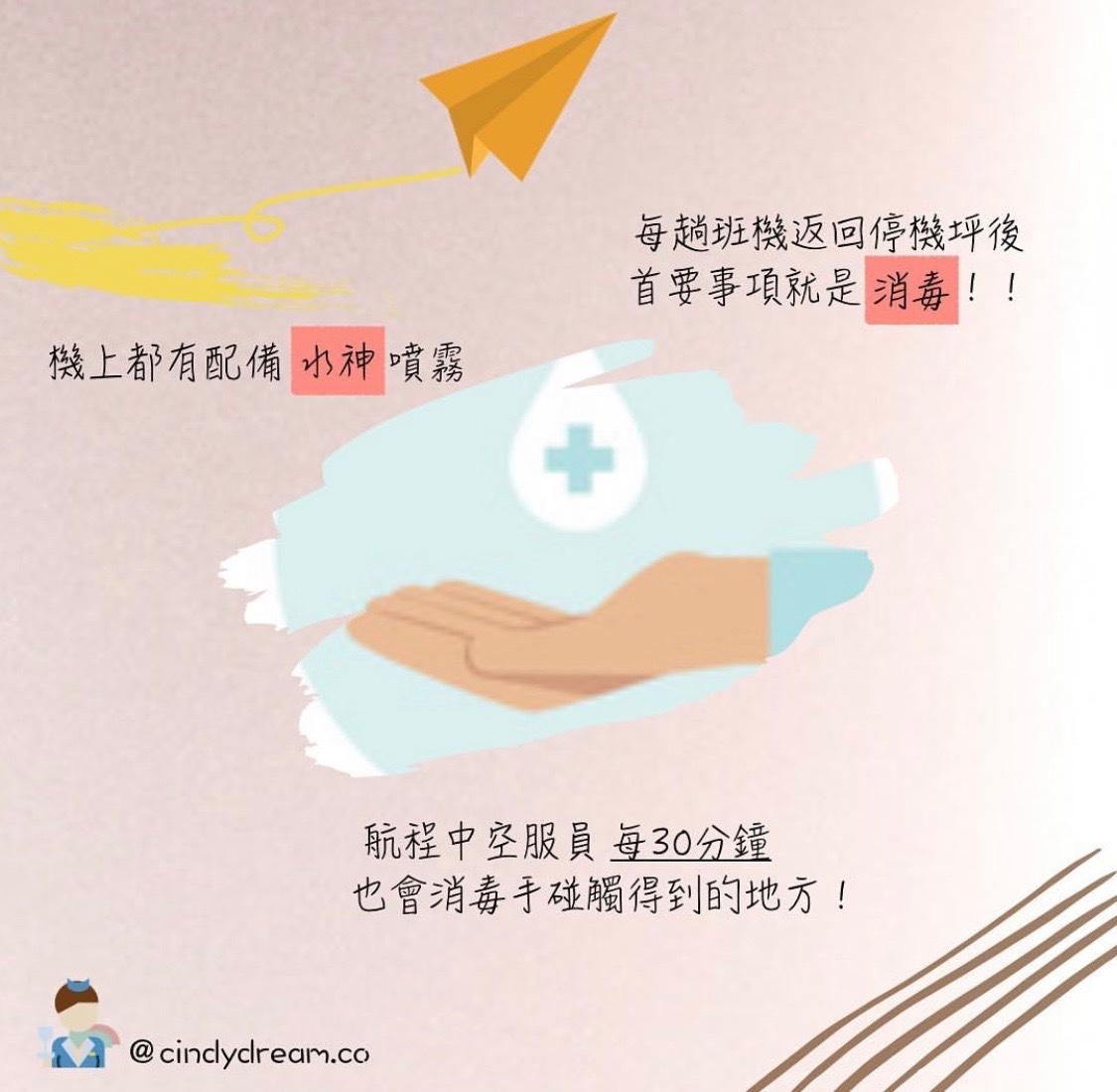 🔑航程中空服員每30分鐘都會拿著消毒噴霧,消毒各個手會觸碰到的任何地方。