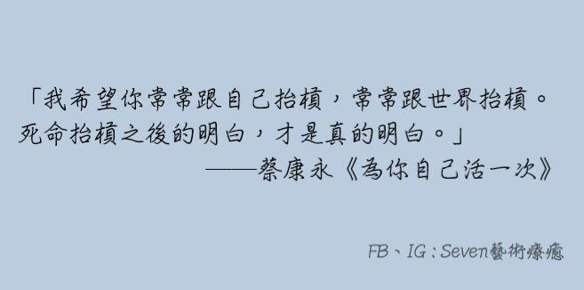 「我希望你常常跟自己抬槓,常常跟世界抬槓。死命抬槓之後的明白,才是真的明白。」──蔡康永《為你自己活一次》