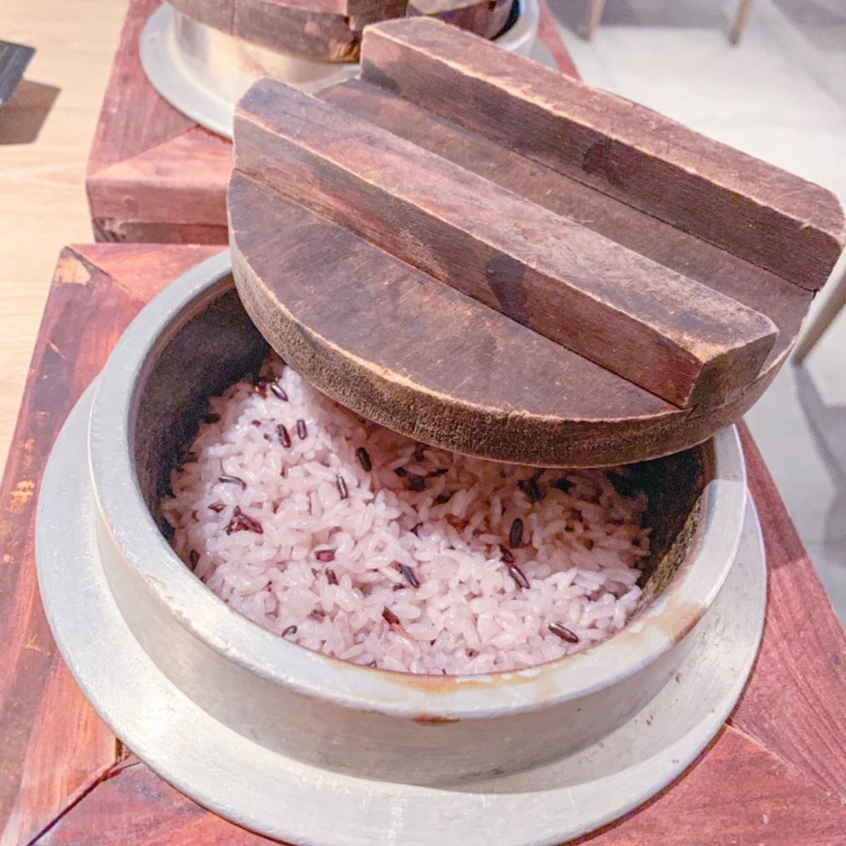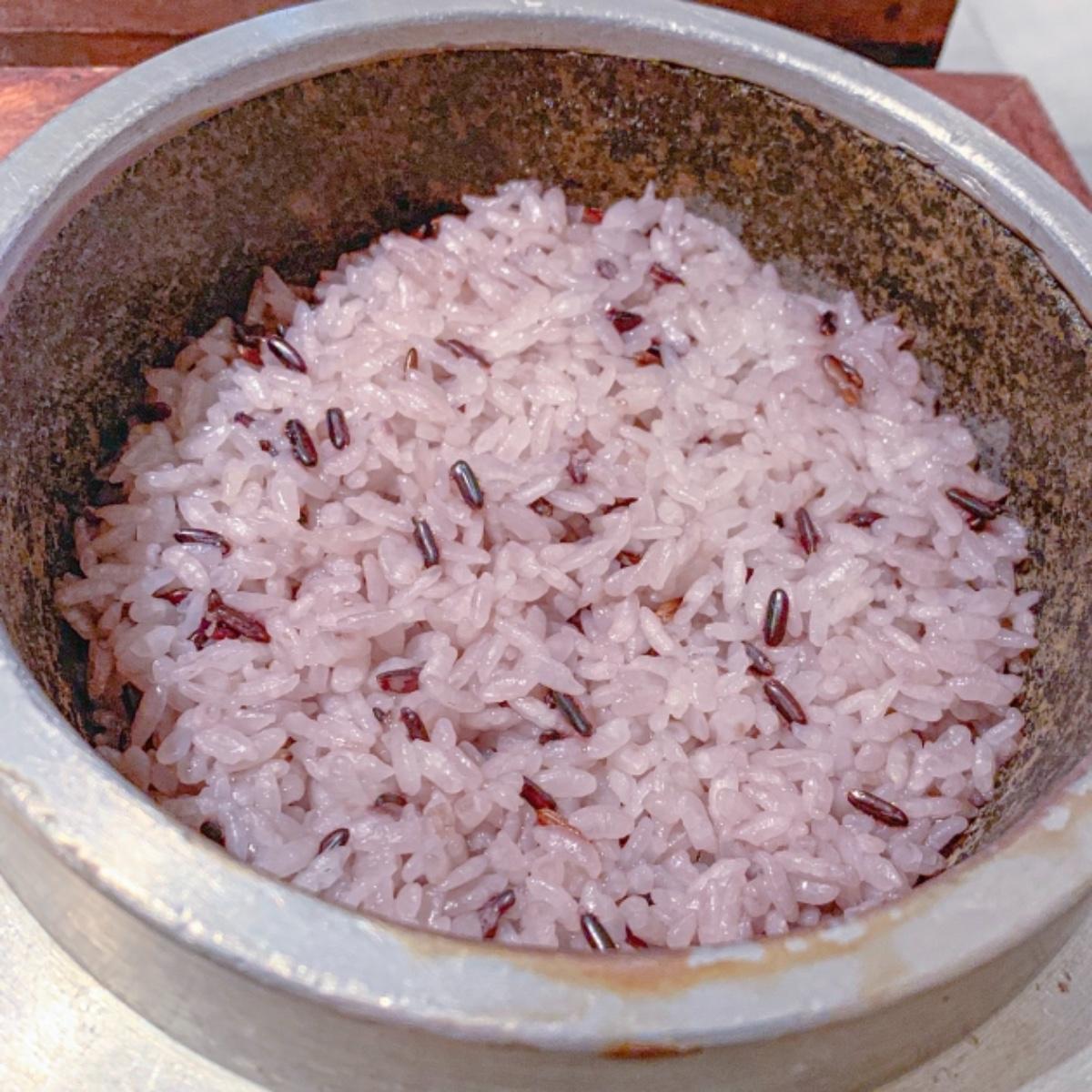 由於泡菜本身就會辣,所以這道只能調整辣度唷~滿滿的泡菜、肉片、蛤蠣、青菜、豆腐、蛋。辣辣的非常開胃,一口接著一口呢!一樣也有附上一大鍋的紫米飯!