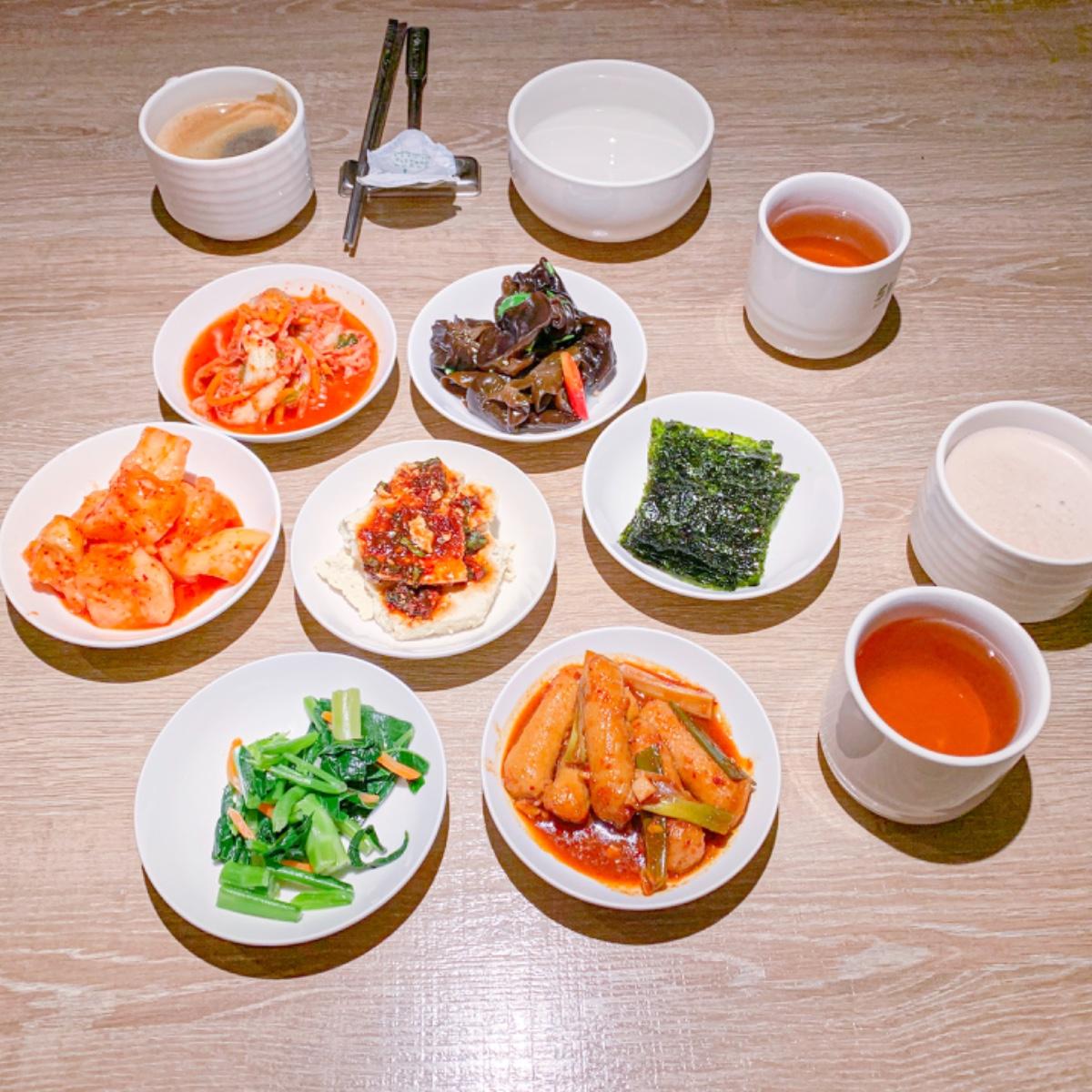 小菜有七樣,分別為涼拌木耳、韓式泡菜、韓式醃蘿蔔、涼拌青菜、辣炒甜不辣、豆腐、海苔片。其中除了豆腐和海苔片不可以續吃,其他小菜吃完都可以拿著空碟子自助式的無限供應唷❤️