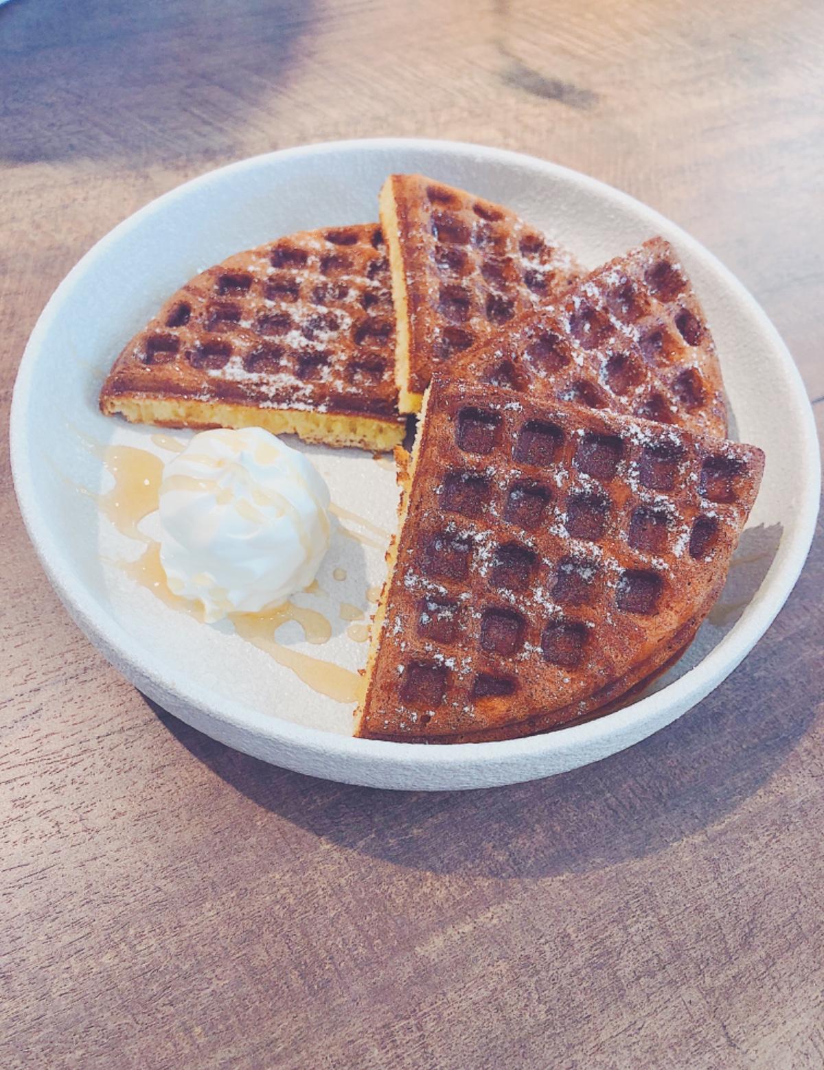 鬆餅有一定的厚度,上面淋著蜂蜜,搭配旁邊的鮮奶油一起吃風味會更有層次喔!