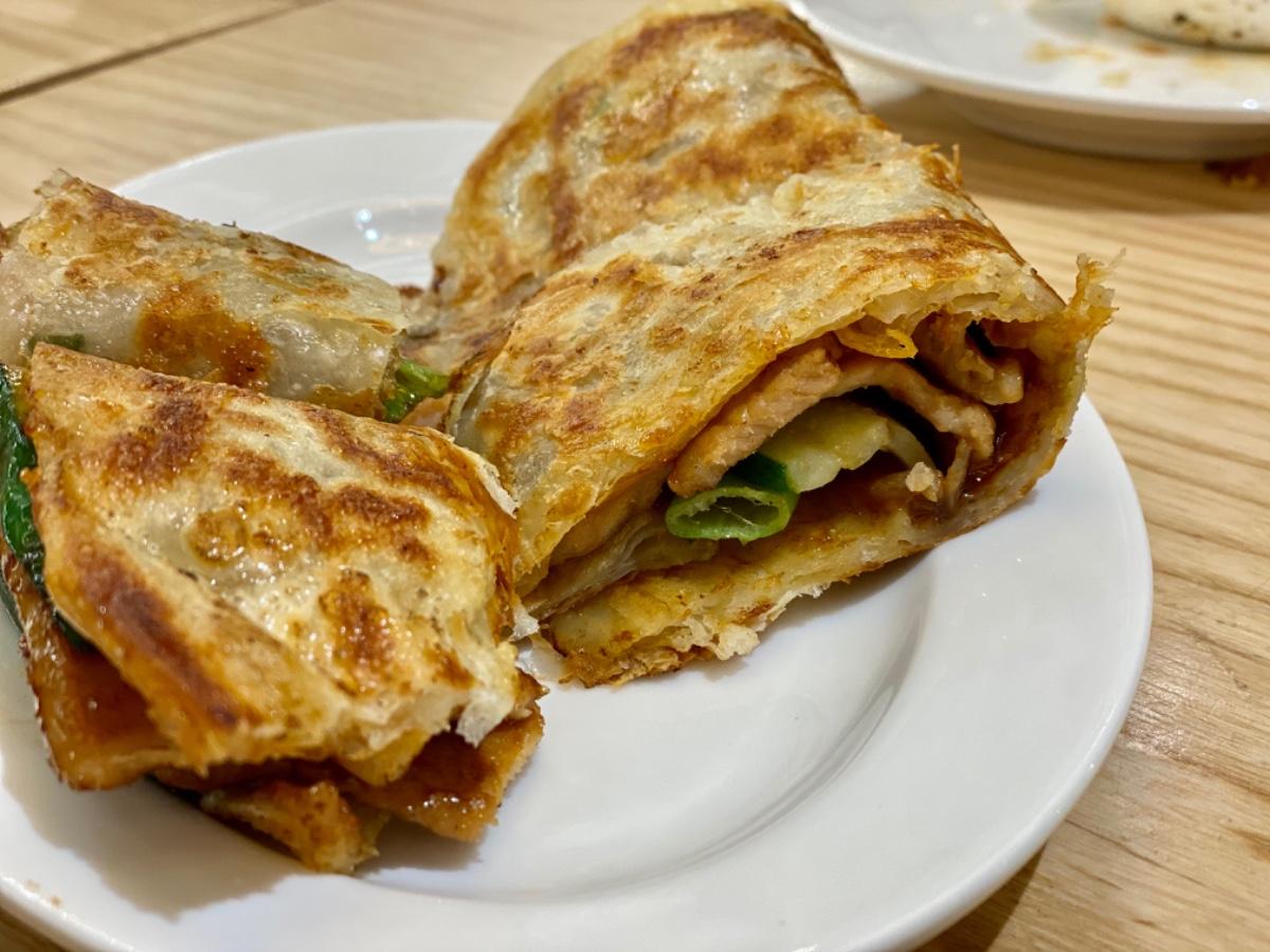 🗣捲餅煎成黃金色,很酥不油膩,裡面的黑豬里肌肉很嫩也給的非常大塊,醬料部分給的很大方,咬下的每一口都吃得到,唯一不過癮就是蔥口感不夠啦~
