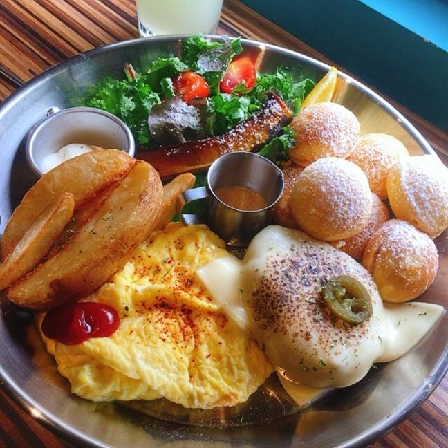 ➡️漢堡排口感多汁可惜份量較小,店家鬆餅球口感鬆軟建議搭配醬汁才不會乾乾的,配餐則是跟田園紙包一樣,歐姆蛋溼滑軟嫩的口感大加分😋