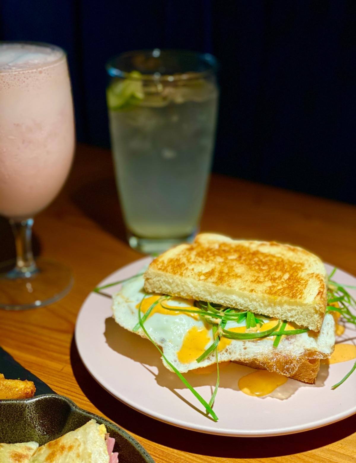 烤的微焦的吐司,搭配火腿、起司、半熟蛋跟青蔥絲,口感濕濕潤潤味道很夠,搭配青蔥微微脆脆的口感,味道很夠蠻好吃的!
