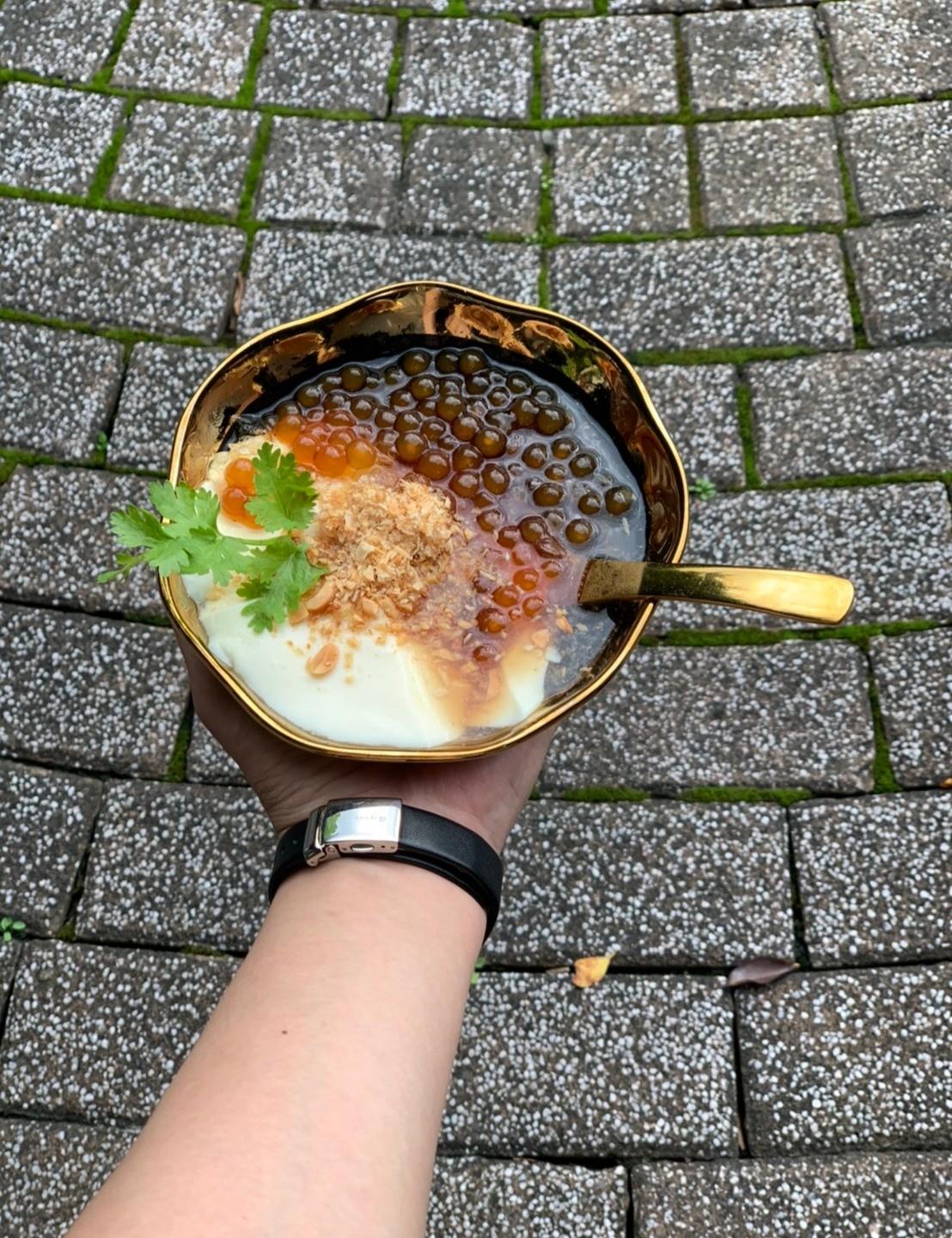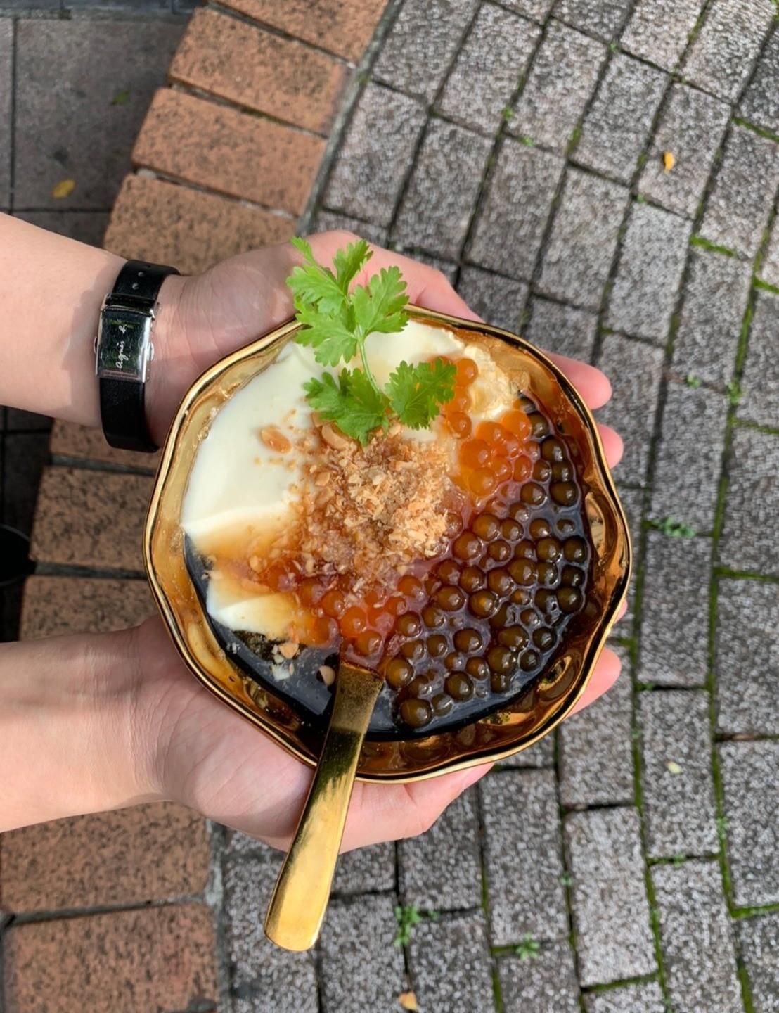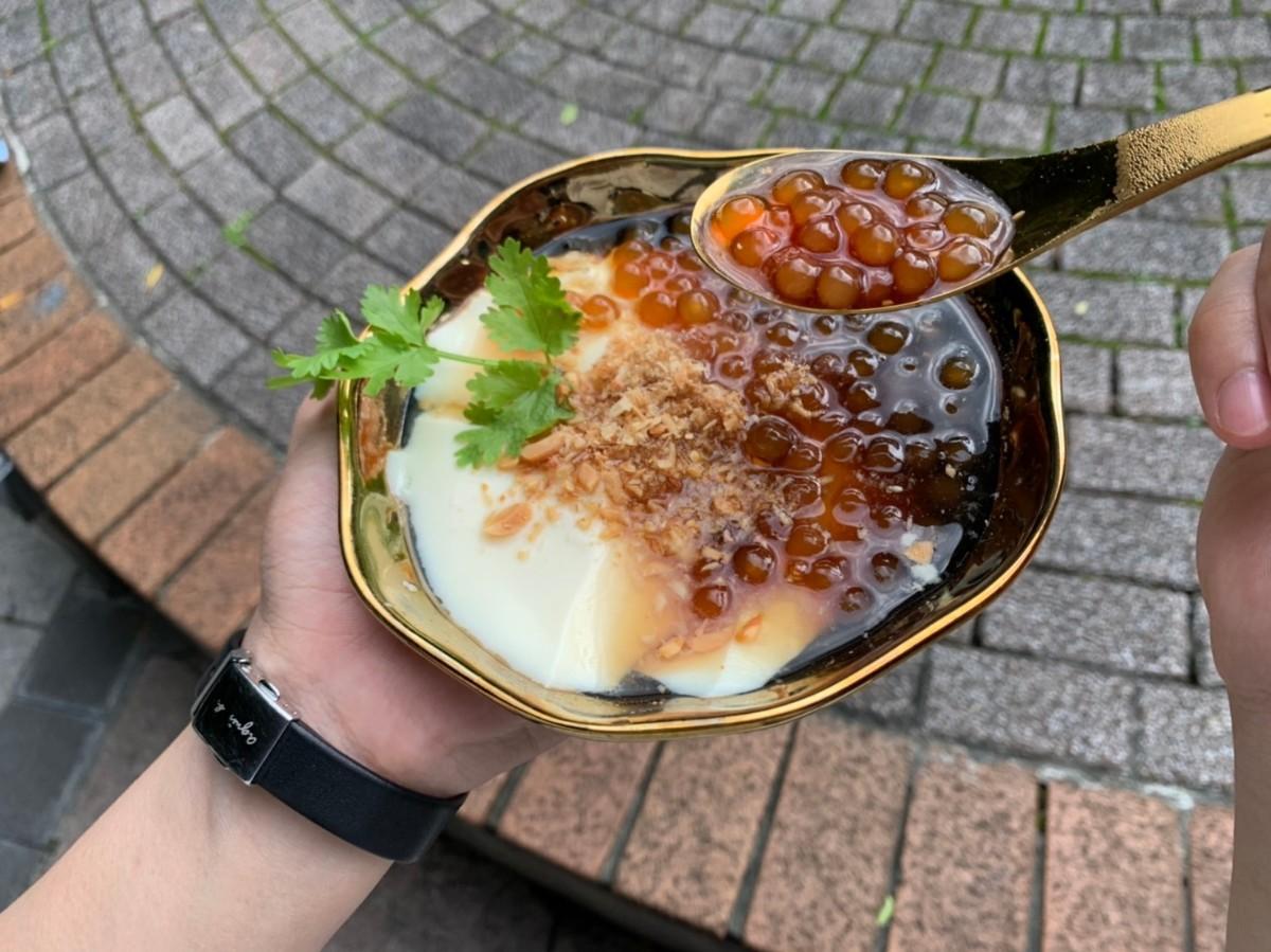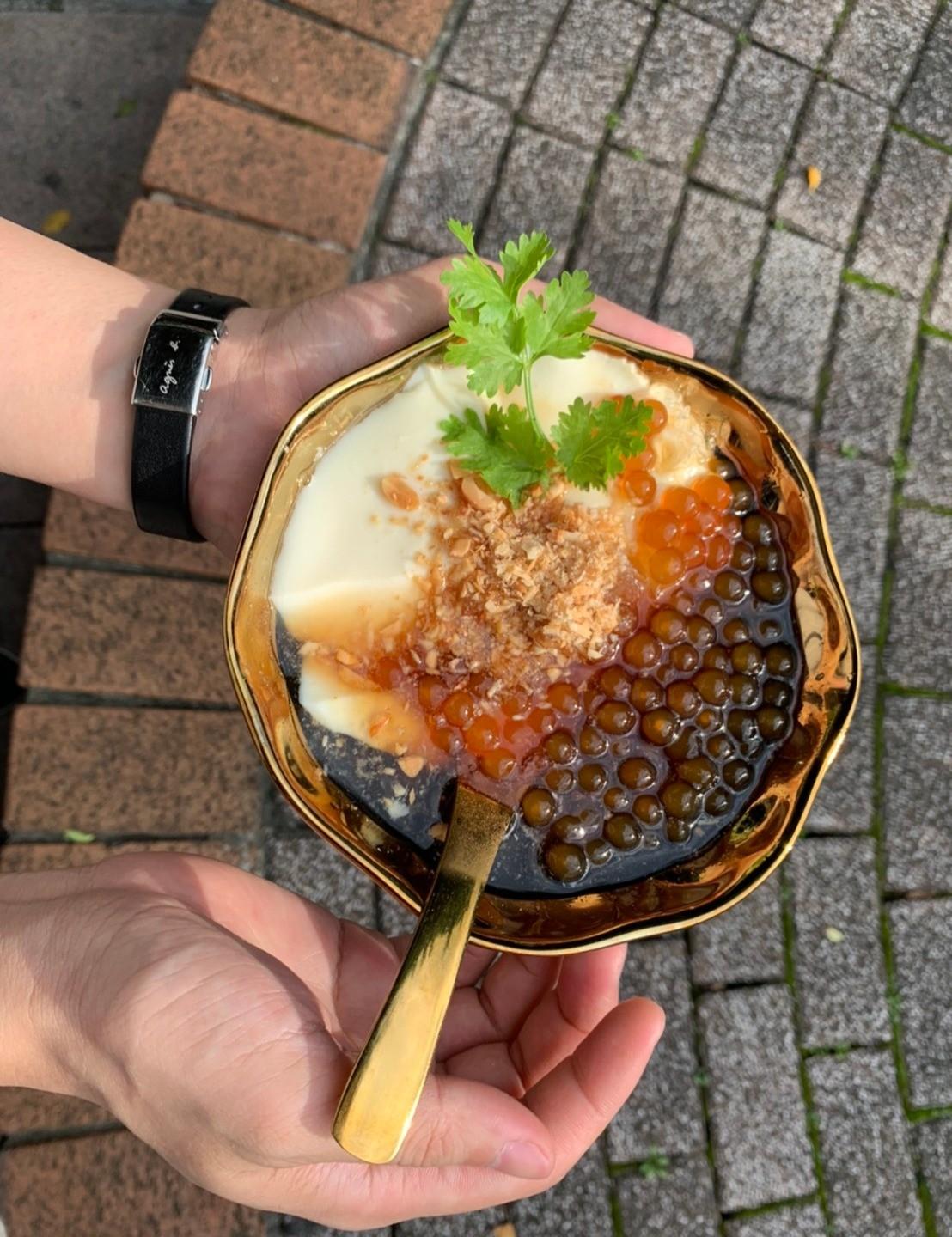 白嫩的豆花與琥珀色的粉圓、加入花生粉、麥芽糖,最後擺上小朵香菜(據說靈感是來自潤餅捲,邰哥可能會崩潰),讓人忍不住搶先餵食手機,連路過的外國人與民眾都不禁駐足觀看