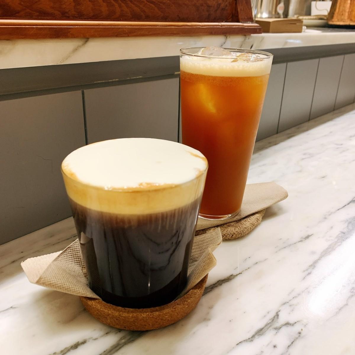 檸檬紅茶上面還有放上現磨的檸檬皮增添香氣!很好喝!奶油咖啡是第一次喝到的口感咖啡上面有蓋上一層厚厚的奶油奶蓋👍🏻👍🏻好好喝~