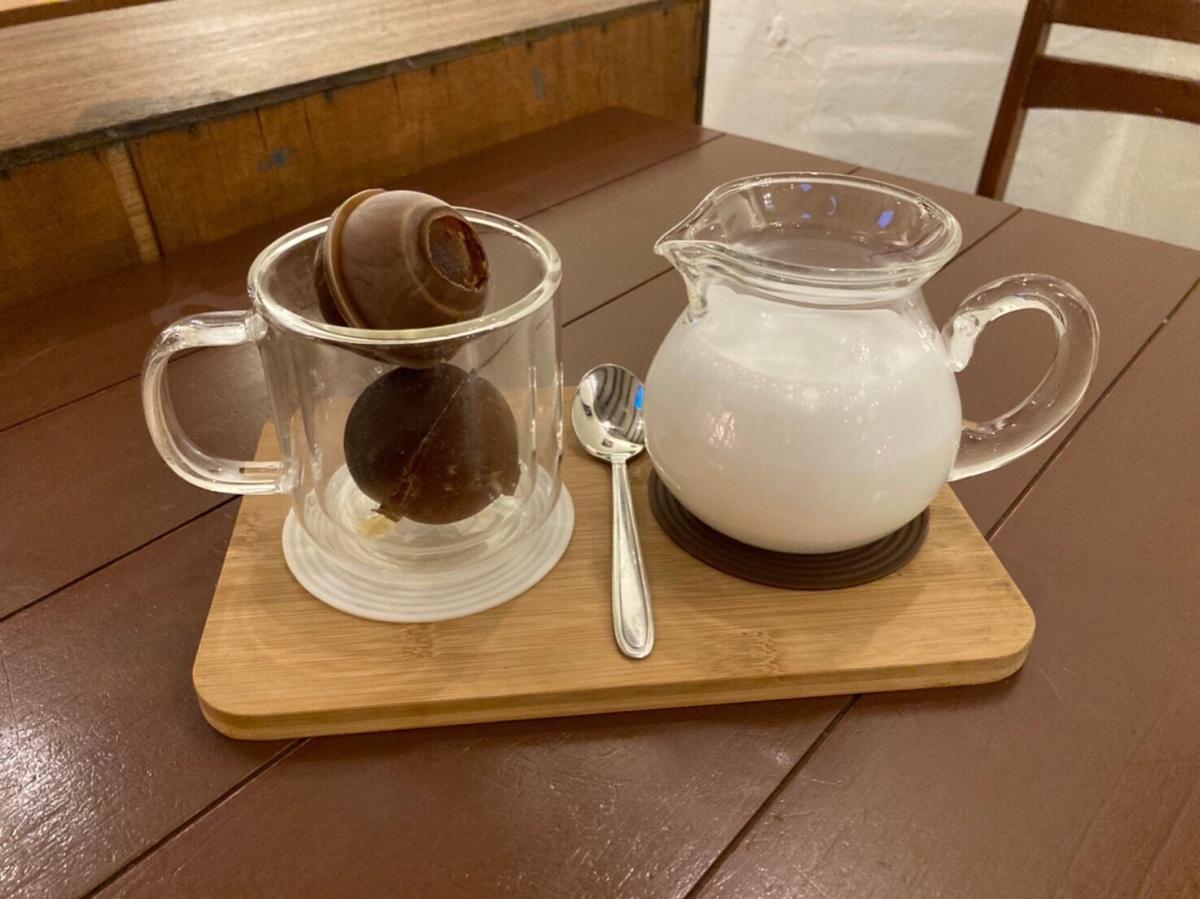 平常都主要喝熱拿鐵,但這幾次開始嘗試「視覺系」飲品系列,所以選了「水晶球拿鐵」。剛送上來的模樣就非常討喜,接著要將牛奶倒入裝有咖啡冰球的杯裡也是非常療癒,靜靜的觀察牛奶與咖啡冰塊逐漸融合的變化。