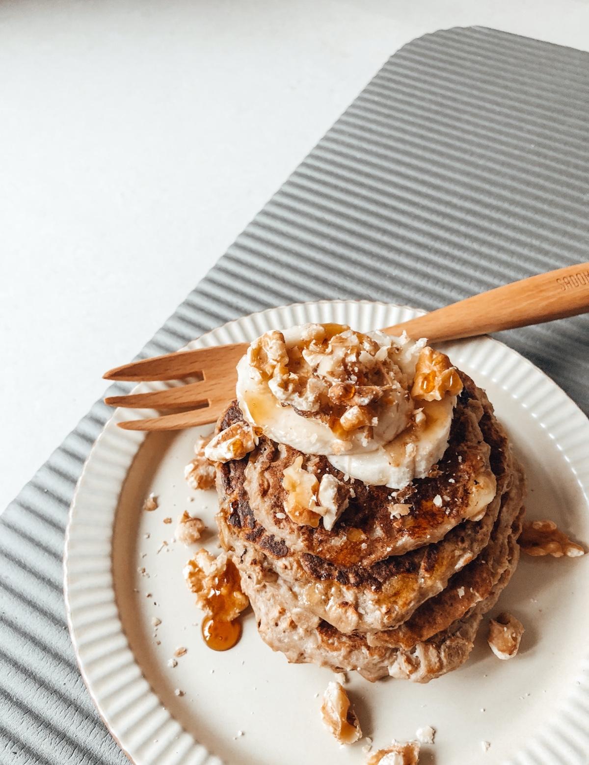 跟大家分享一個簡單又好吃的食譜 只需要雞蛋、香蕉、即食燕麥片就可以輕鬆完成 首先~將香蕉搗成泥(我是懶人直接用食物調理機攪) 然後將一顆雞蛋打散後把香蕉泥加入,兩個攪拌均勻 接著加入即食燕麥片,份量視香蕉跟雞蛋大小而定 大概是攪拌到覺得稍有阻力,不會到處流動就可以 然後在平底鍋薄刷一層油 接著將麵糊分次倒入煎熟即可 注意熱鍋後轉中小火煎,因為香蕉有糖份容易焦 都煎好之後疊起來,外面topping隨個人喜好 可以加莓果類、堅果、淋上蜂蜜 天呀~超好吃又無負擔的一道料理就完成了 (還沒甚麼技巧可言,因為超簡單)