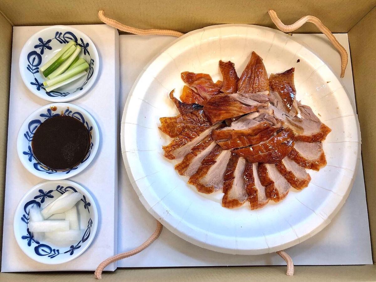 圖6、7為外帶盒,半隻均附 北方烙餅6片/ 甜麵醬1包/蔥段1份/柚香蘿蔔1份,油亮酥脆的外皮,肉質不柴,配上柚香蘿蔔酸甜的滋味很清爽