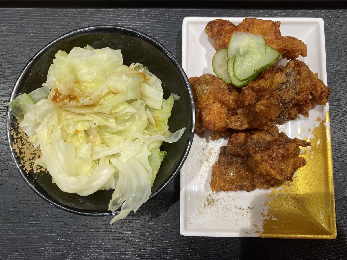 唐揚炸雞,鮮嫩多汁,完全不柴,唯一覺得不夠好的唯有燙青菜,份量少,味道太過平淡…不優。