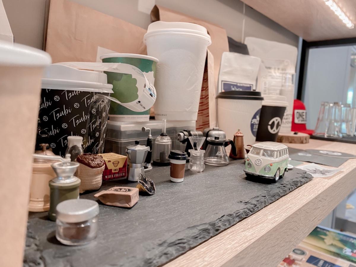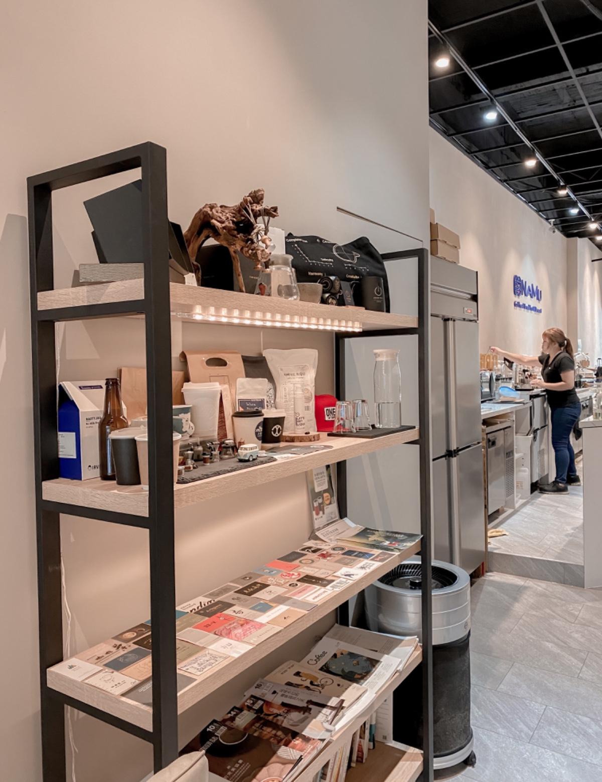 旁邊的五層架上,展示著一些關於咖啡的可愛小週邊