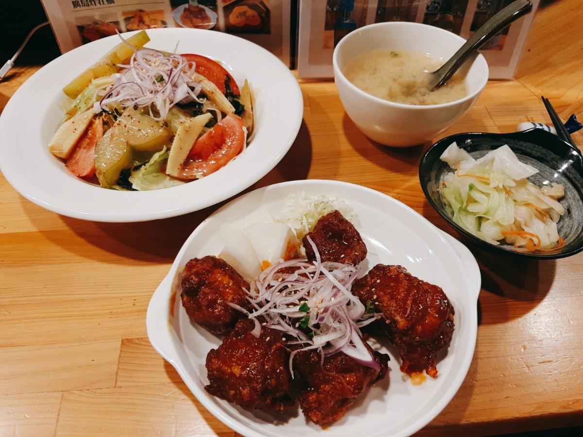 轟炸雞定食跟白飯是分開放,跟一般定食都會把菜餚鋪放在白飯上很不同,