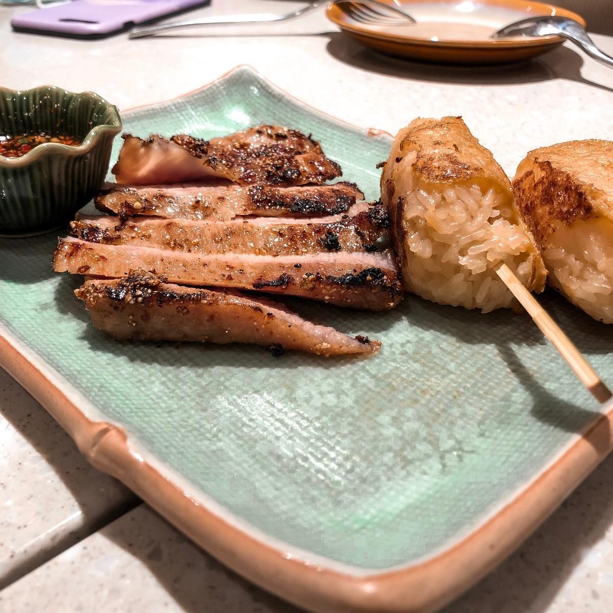 豬排選用松阪豬肉醃漬,吃起來油花分布均勻、多汁,糯米串吃的到椰香味,外酥內軟