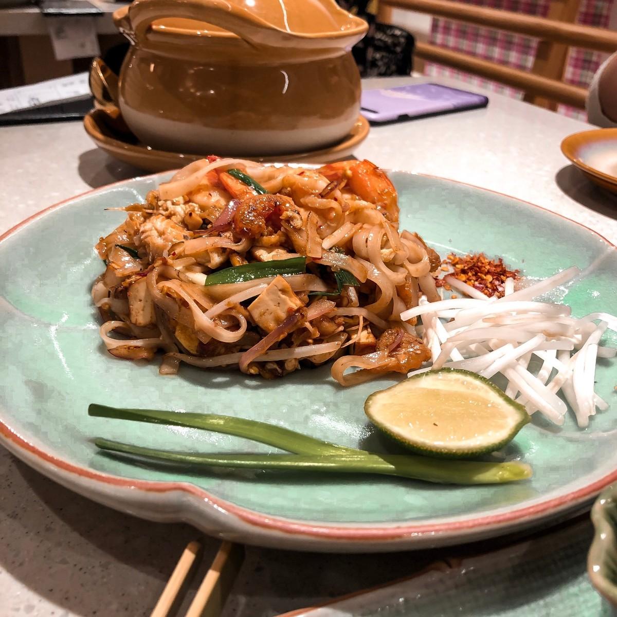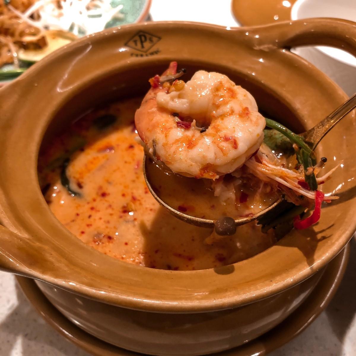 冬蔭功即是泰式酸辣湯的意思,裡面有好幾隻蝦子,喝起來不辣、偏酸,有別於一般傳統道地的泰式料理,椰奶味沒有很重