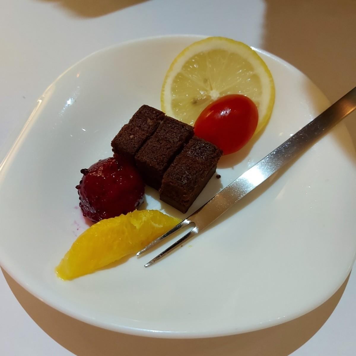份量很精緻,苦甜又好吃的生巧克力蛋糕,不會很死甜口感結實,生日壽星可以再享有一份。