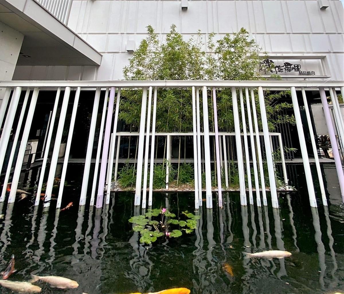 氣派的餐廳連廁所造景都很浮誇,通往廁所的路上是半露天空間,一樣有魚池造景,還有一些樹木,日式氛圍很舒服。