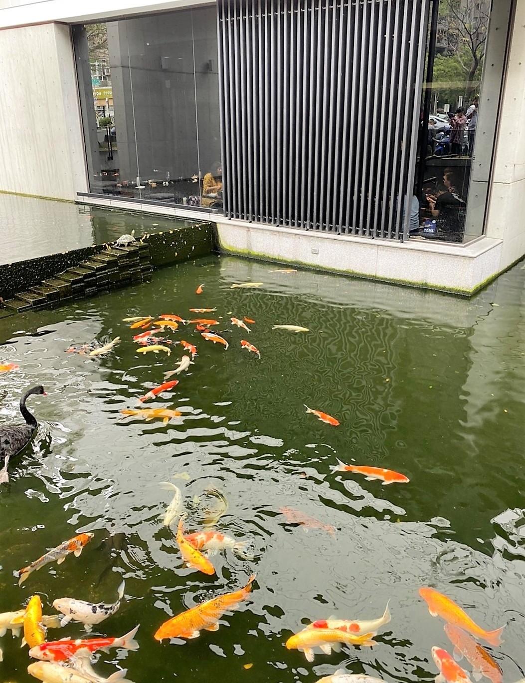 窗邊可以看到外面的鯉魚池,小孩們吃飽可以觀察烏龜,黑天鵝還表演展翅~