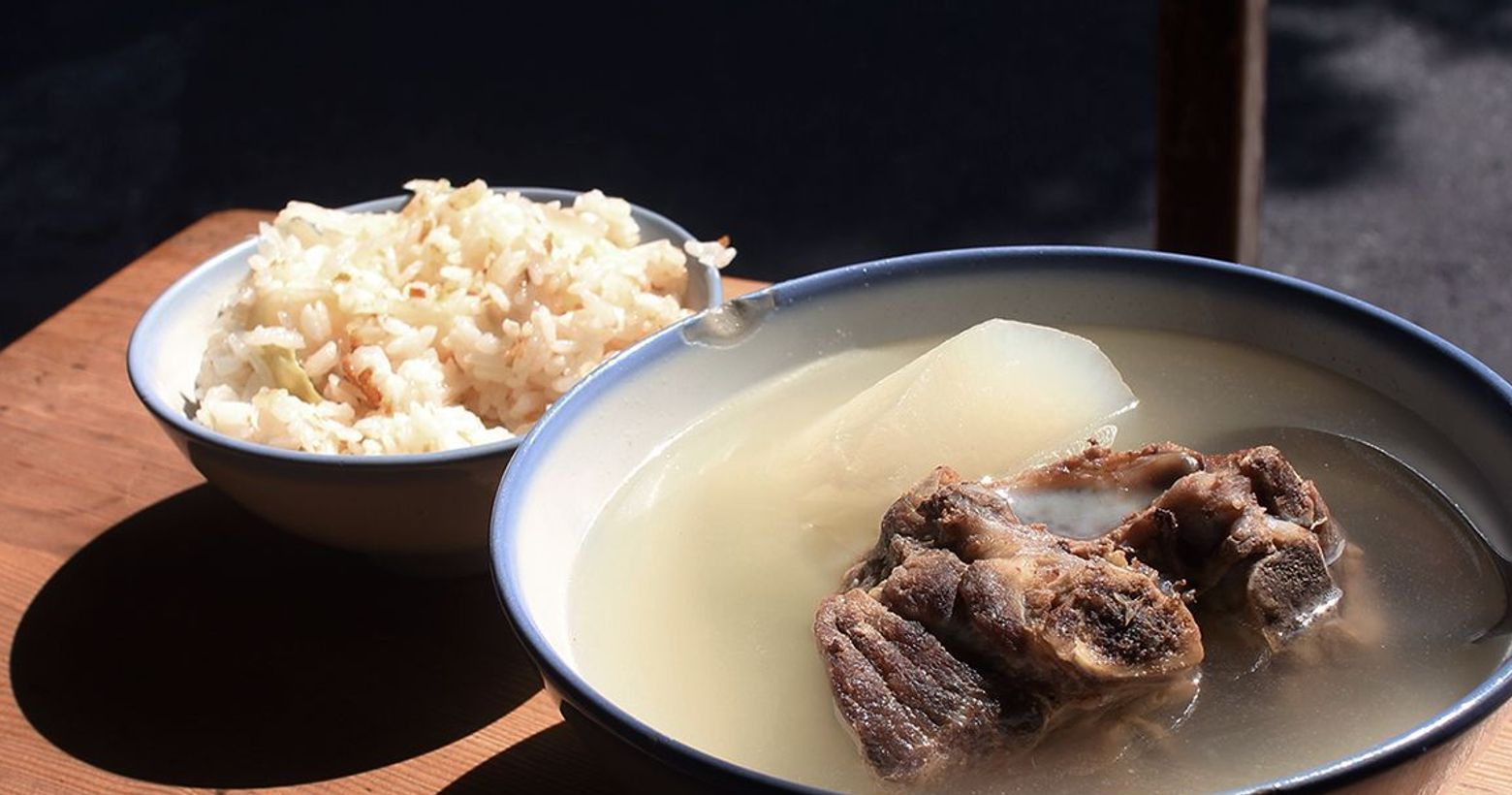 陽光正大的中午,坐在沒人想坐的直曬區,吃碗排骨湯和高麗菜飯。