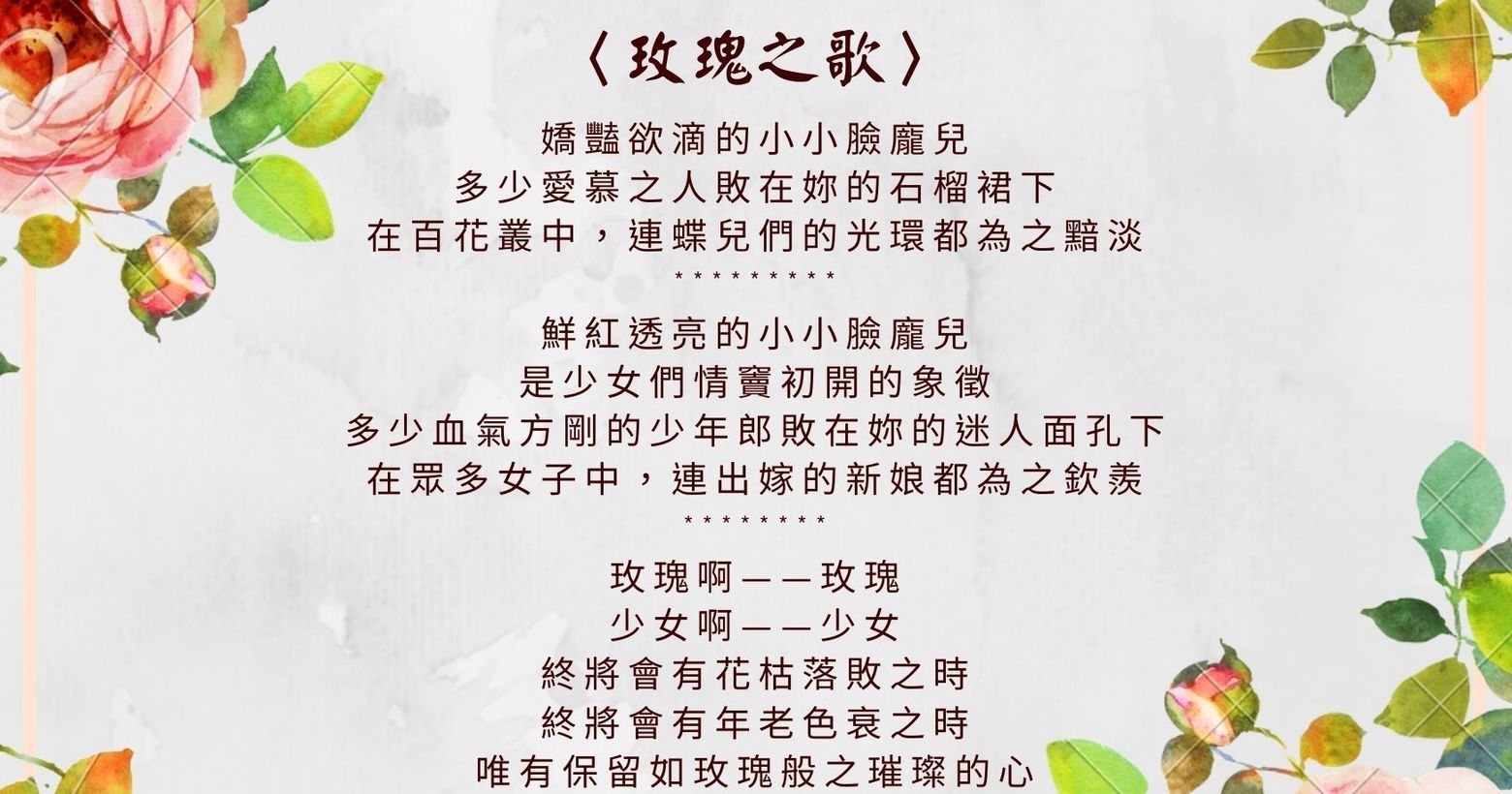 玫瑰之歌 1 / 1 美麗的年輕容顏,終究會有衰落之時,如有人愛妳容顏更勝妳的內心,請小心謹慎相處之;如有人愛妳的內心更勝妳的容顏,請好好珍惜愛惜之。內心的善良和智慧,是上天賜與人類永恆光輝的美麗寶物。 涵喜歡用文字和照片表達內心的感受,喜歡彈琴