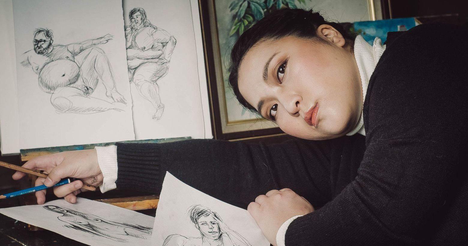 所以在做這幅作品時,依循索福尼斯巴·安圭索拉的穿著,高領、黑毛衣、長裙以區隔於當時的裸女風氣