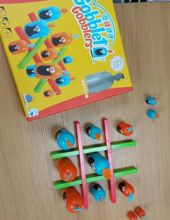 剛下班的我們都無法用腦,所以要先從不用腦的遊戲開始,只有兩個人到的我們,先玩了老闆介紹的奇雞連連,其實他就是圈圈叉叉的變體版,只是把放到九宮格內的改成雞,誰先連成一條線誰就贏了!不一樣的地方在於大雞可以吃小雞,沒想到多了這個規則遊戲就變的很有趣!我突然的大意就被連成一條線了!這個遊戲非常老少咸宜,很適合和小朋友一起玩。