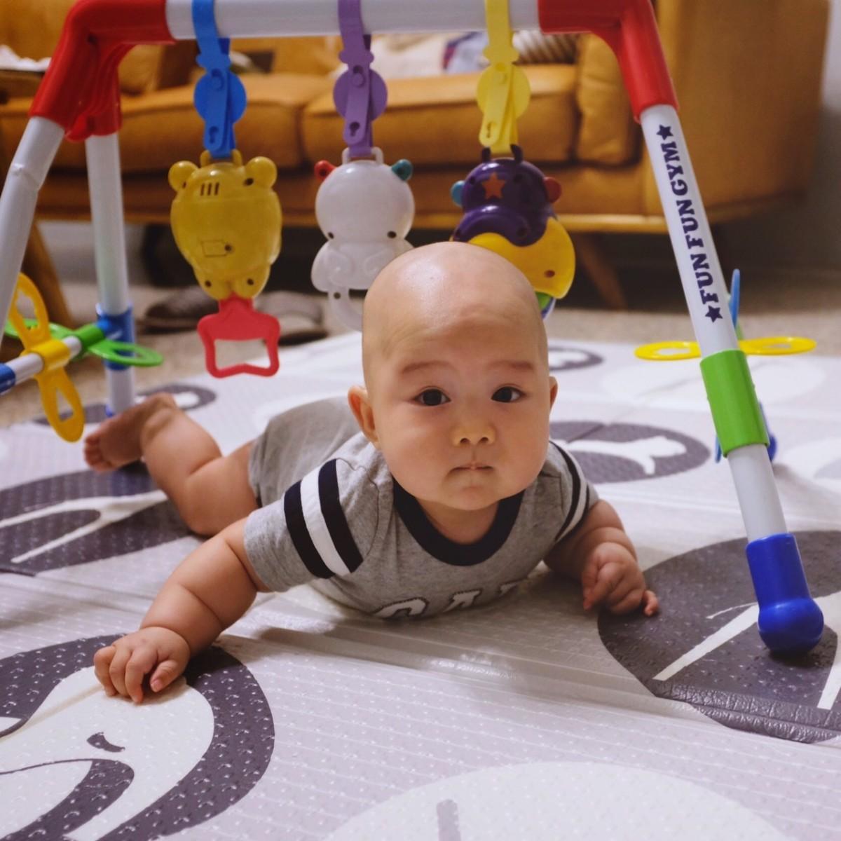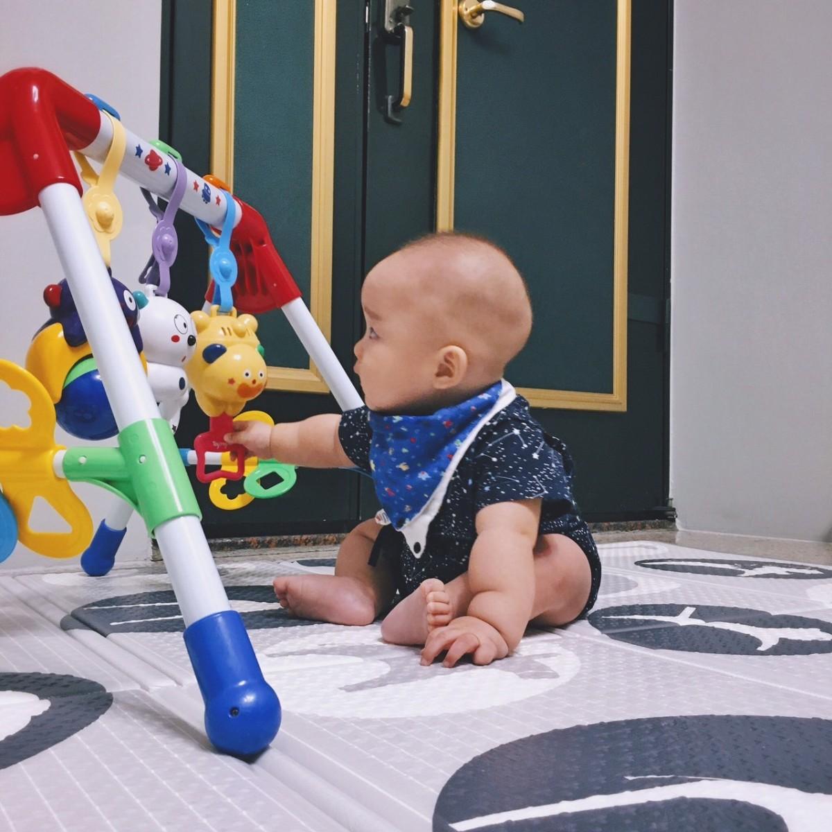 0-2個月的時候躺著就可以看到玩具,3個月時就有伸手想要推玩具的動作喔,這一個玩具目前使用過程中都沒有移動、傾倒的現象,玩具固定的效果不,安全上大加分。