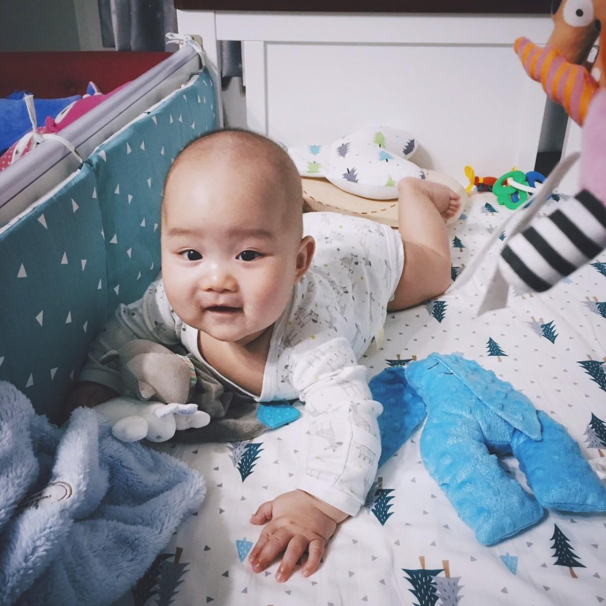 滿月就開始讓小風趴在我的胸口,2個月的時候趴在枕頭及哺乳枕上,每次練習五分鐘的抬頭,3個月大之後進階趴在安全的平面,每次練習約10~15分鐘,練習讓小風自己玩,每次都會稍微拉長時間,感覺到有點不耐煩時會利用玩具吸引小風目光,趴在水墊上涼涼的、軟軟的,小風立刻又玩起來了。