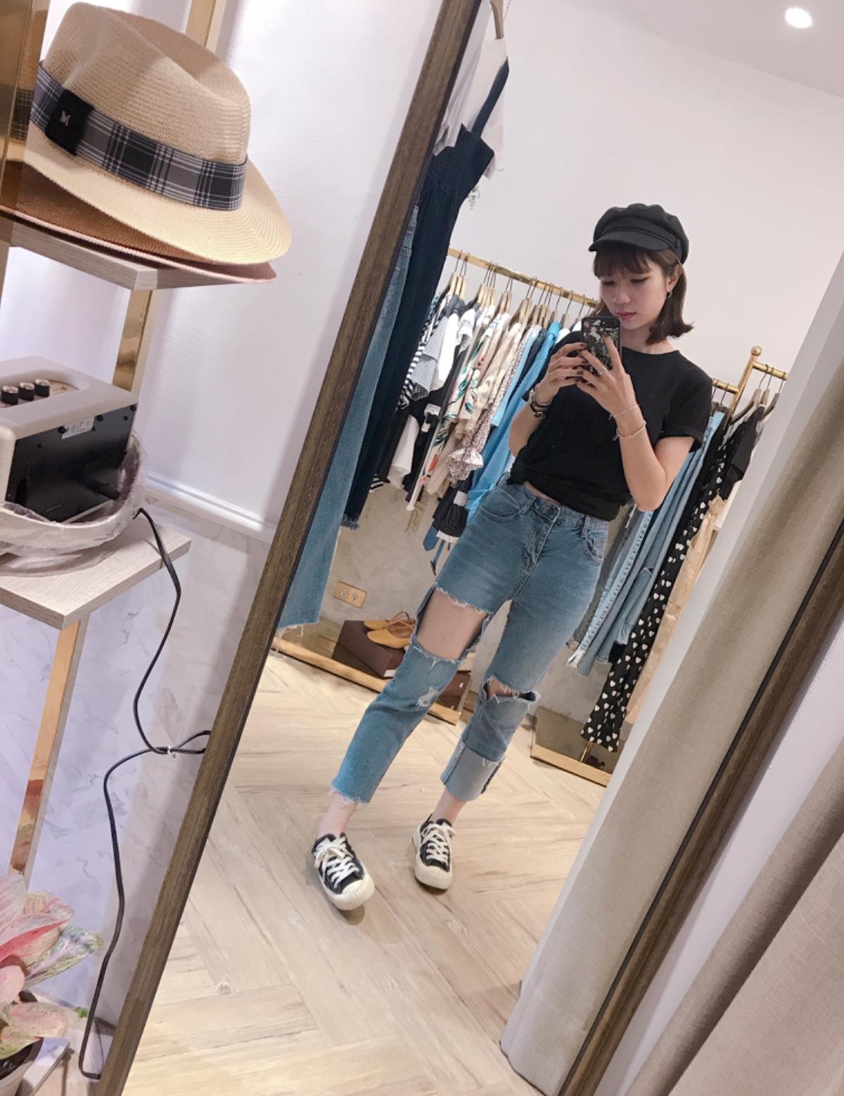 人像黑色休閒T-shirt搭配造型刷破九分褲