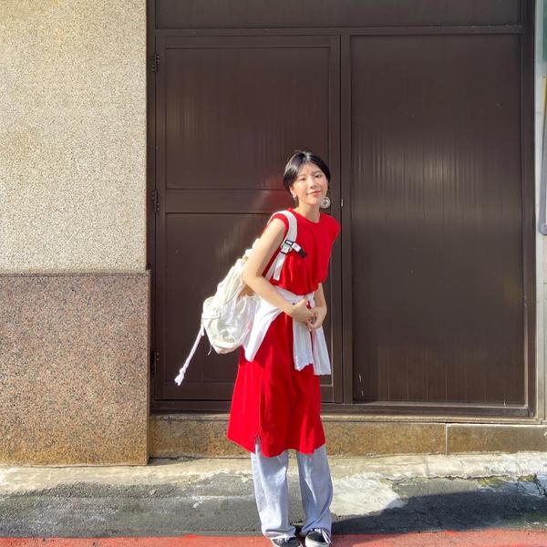 不對稱層次拼接撞色長版上衣
