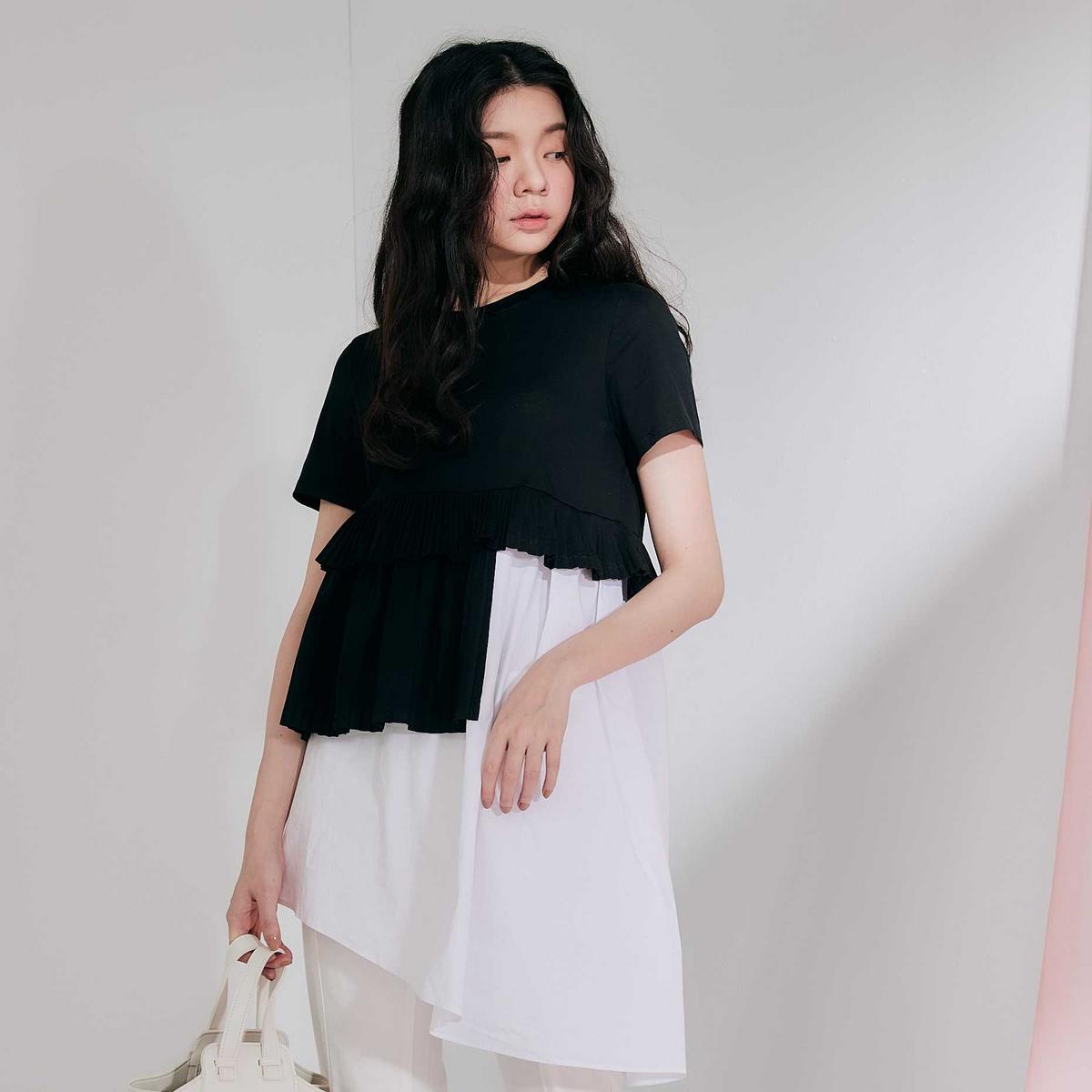 最後來跟大家分享這一款純棉拼接的上衣,除了撞色,更在布料上製出摺皺且層次的不規則效果,是一套可甜美、可率性的上衣。蓬鬆下擺的左右高低差,有修飾腿型的效果,無論是出門喝咖啡、與姊妹淘聚會或是穿去上班,搭配淺色褲子與靴子,有型又方便呀!擔心天氣稍涼,還可以再搭配牛仔外套,是不是不難搭呀~