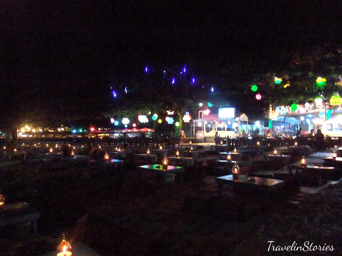 Sai Kaew Beach旁的店家陸續開起五彩繽紛的造型燈更突顯Koh Samet夜晚浪漫的氛圍。遊客開始零散地出沒覓食,等著每到晚上八點,由泰國小鮮肉免費帶來刺激又絢爛的火舞秀表演。